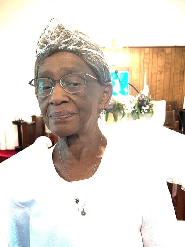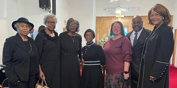 Nancy Mills left, Ada Harbison Treasurer, Mary McGill Secretary, President front center, Anne Jackson, Pastor Caldwell far right and welcomed guest.